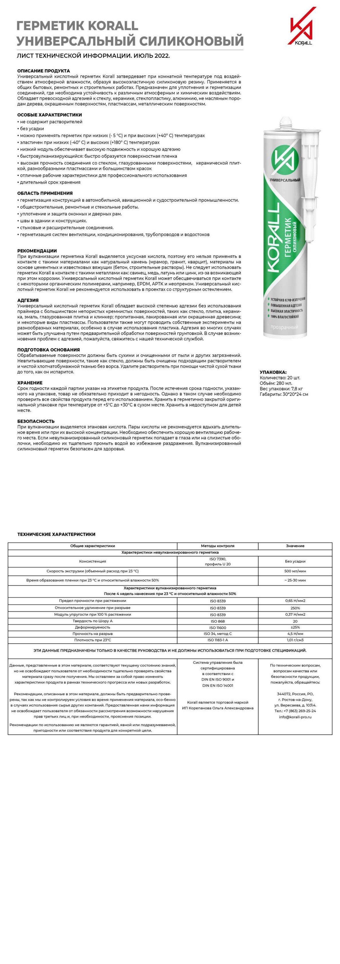 Универсальный кислотный герметик Korall затвердевает при комнатной температуре под воздействием атмосферной влажности, образуя высокоэластичную силиконовую резину.